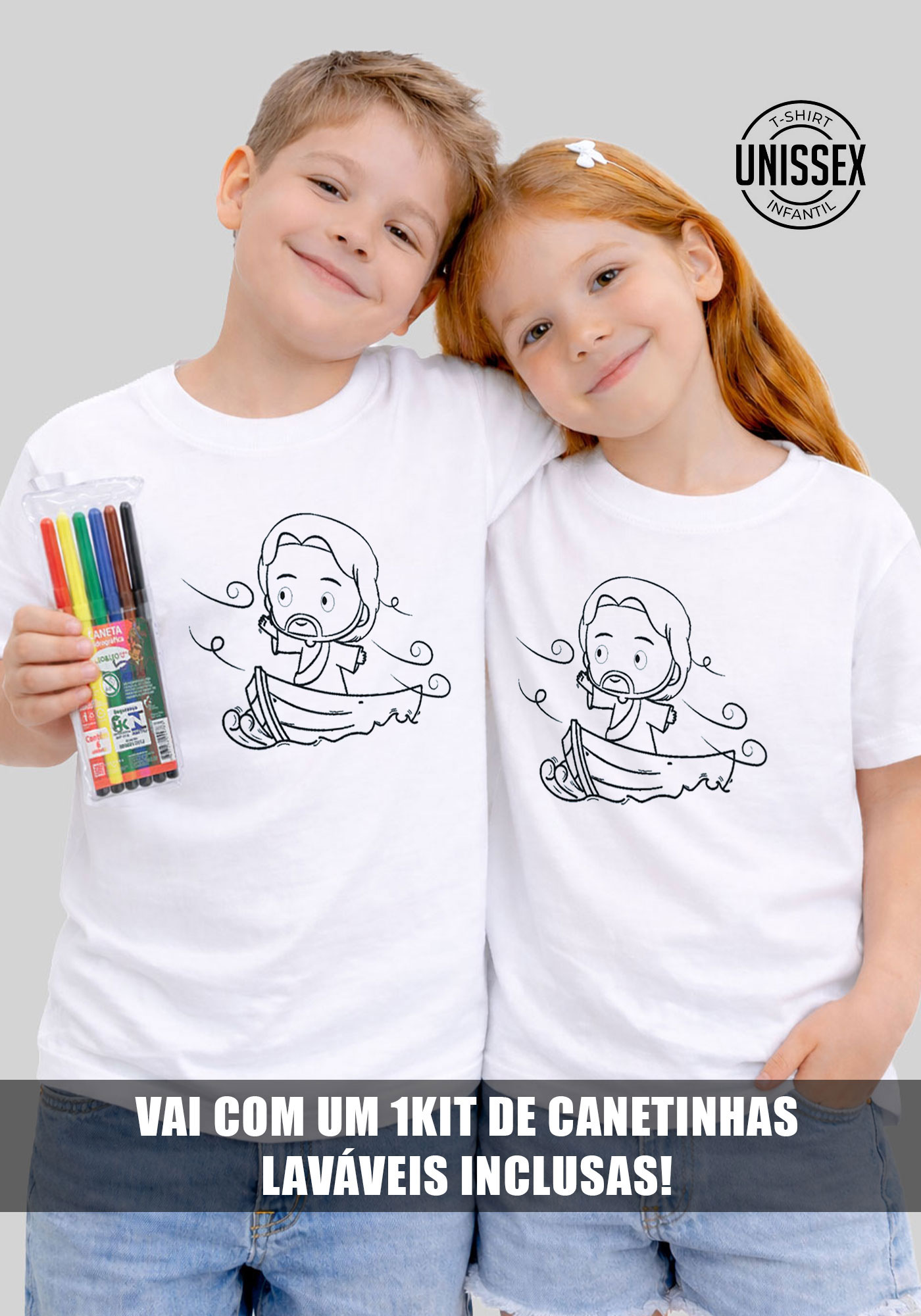 CAMISETA INFANTIL CRISTÃ PARA COLORIR - JESUS ESTA NO BARCO - COR BRANCO