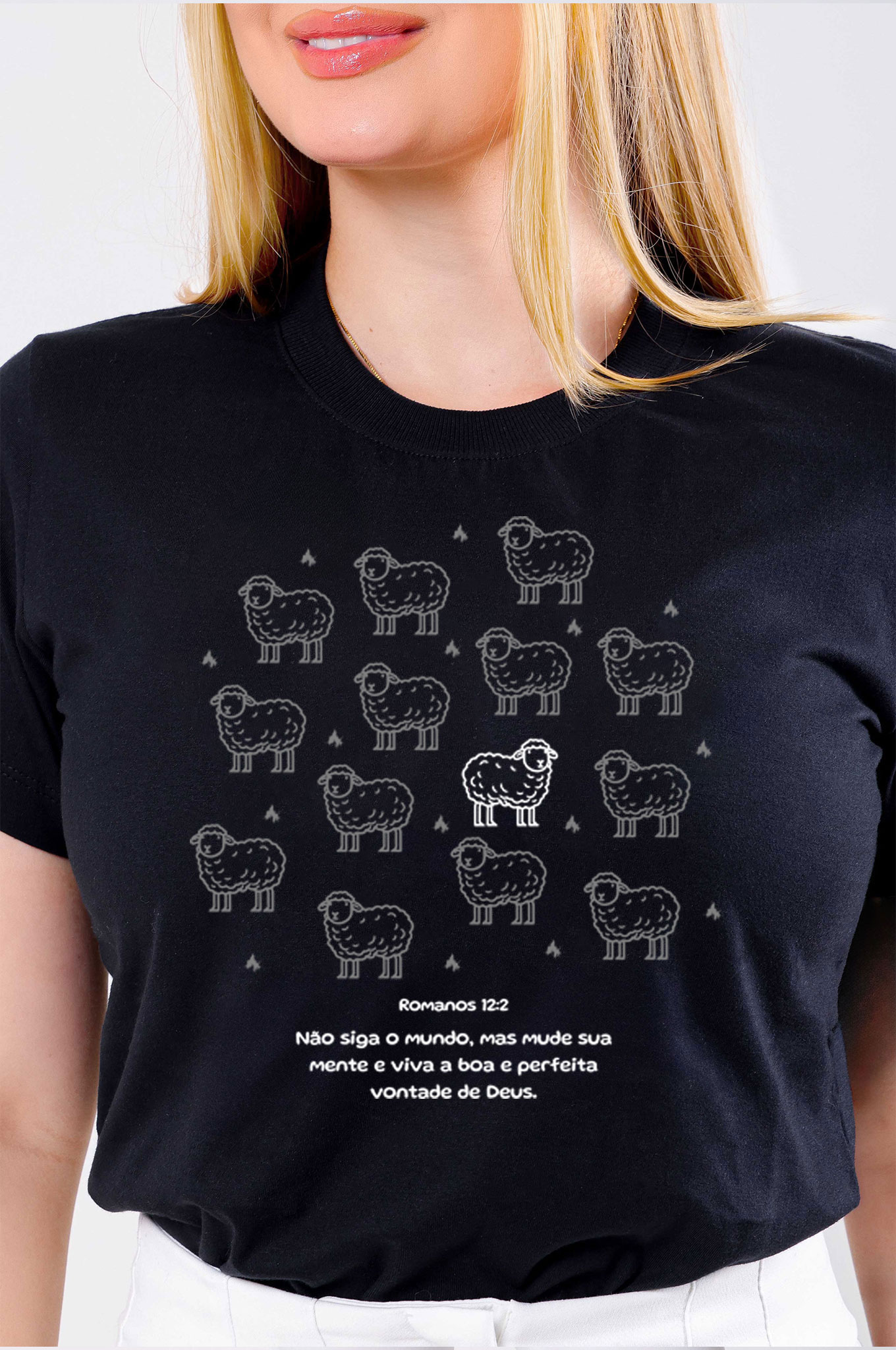 T-SHIRT FEMININA - OVELHAS ROMANOS 12:2 - COR PRETO